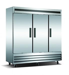 Product Description : This unit is a three door reach in stainless steel freezer. The door is a self closing hinged door, with a 90 degree stay open feature. It includes a recessed handle. Features also include interior lighting, bottom mounted cooling system, electronic thermostat controller and a LED digital temperature display, and auto defrost. Temperature ranges from 0 to -10 degrees. Includes 9 adjustable shelves. It includes a built in security lock and keys. NSF Certified. Free Shipping! Dimensions 81"W X 33"D X 83"H